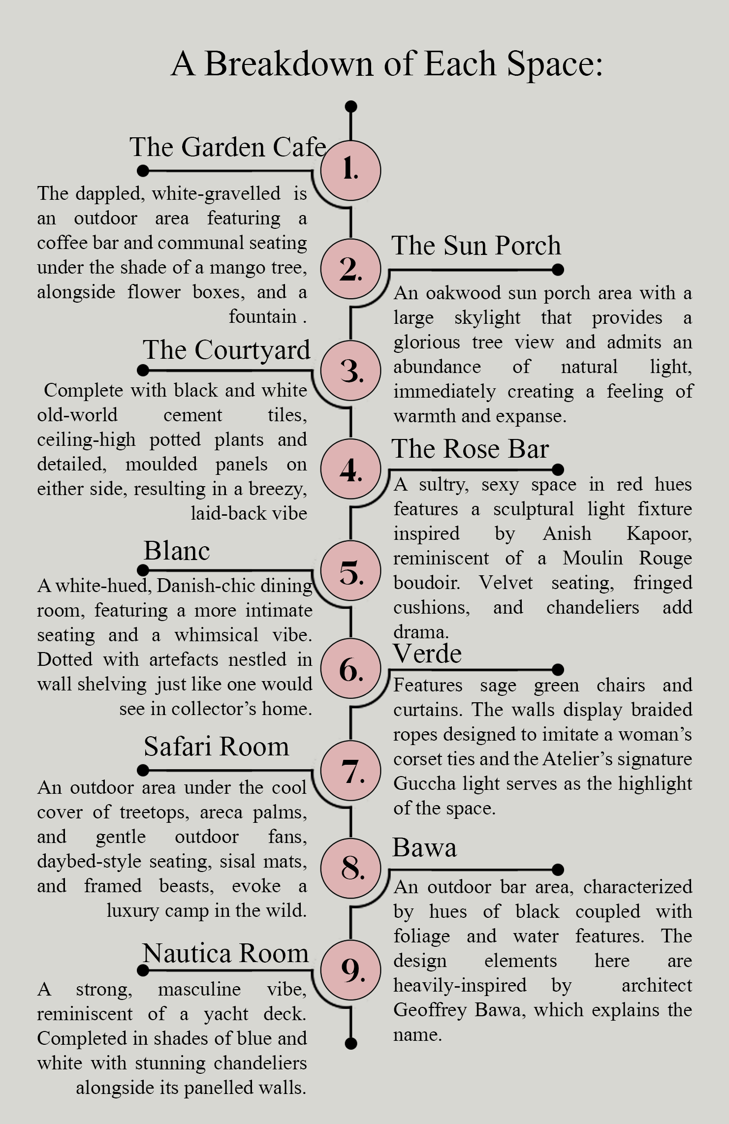 The design process began with various ideations of the story each space would tell. From the start Ashiesh had a vision to grant individuality to each room while weaving them harmoniously into a unified whole. The process began by making mood boards and themes for each space to discuss with the clients. The planning stage of the project was mostly overseen by Ashiesh along with our team lead Lila until the clients finalized the restaurant's theme. We then visualized each rooms elevations using Photoshop, refining layouts through trials. Most of the furniture pieces for this project were designed in-house, crafted by a local vendor.